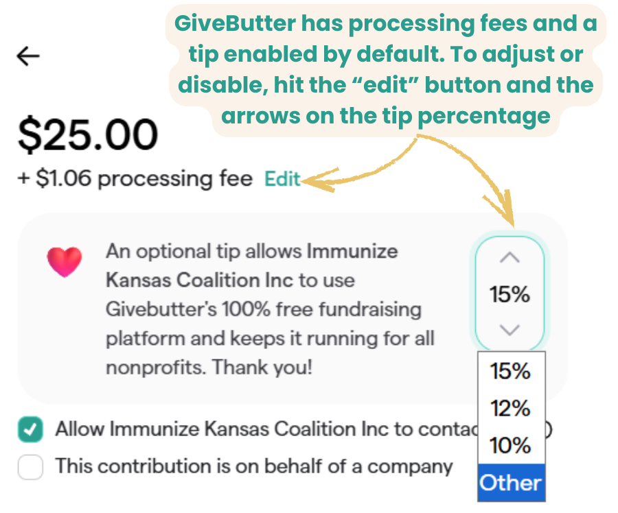 Donations on GiveButter can be made with card, ACH/E-check, Cash App, Paypal or Venmo. GiveButter donations do not charge any processing fees to IKC, but do have an optional tip to cover the platform's operating costs enabled by default which can be adjusted to 0% at checkout.